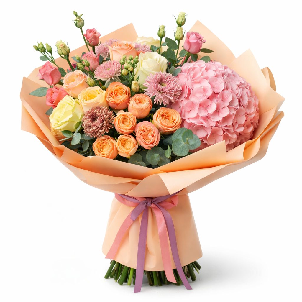 Розовая гортензия, персиковая гвоздика и пионовидная роза создают нежную композицию, дополненную кремовой эустомой и сиреневой маттиолой. Букет украшен зеленью и эвкалиптом, придающими свежесть. Упакован в крафт-бумагу с матовой плёнкой и перевязан атласной лентой. Возможны варианты с декоративной сеткой или фетром. Прекрасный подарок для любимой на день рождения.