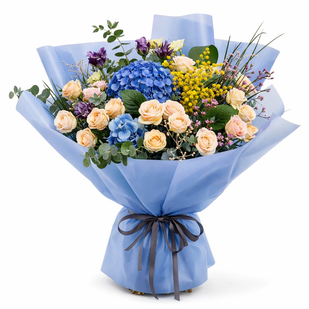 Сочетание синей гортензии, бело-розовой кустовой розы, фиолетовой эустомы и яркой мимозы создаёт неповторимую композицию. Аспидистра и эвкалипт добавляют зелёные акценты. Букет оформлен в матовую плёнку нежно-голубого цвета и перевязан атласной лентой. Возможны альтернативы упаковки: крафт-бумага или декоративная сетка. Прекрасный выбор для поздравления на день рождения или для любимой.