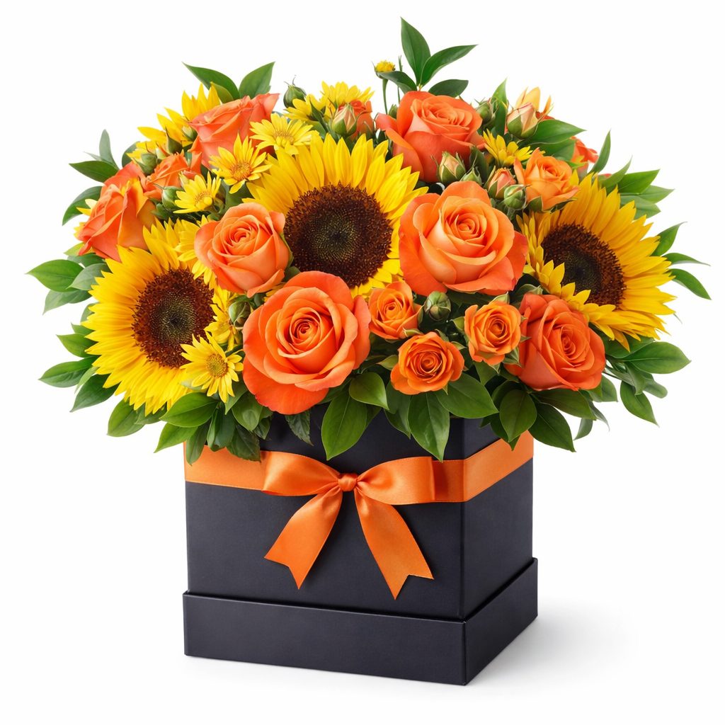 Яркие подсолнухи, оранжевые кустовые розы и альстромерии создают солнечное настроение в этой цветочной композиции. Желтые хризантемы добавляют нежности и гармонии. Композиция оформлена в стильной квадратной коробке. Возможны альтернативы: бархатная коробка или коробка с принтом. Прекрасный выбор для празднования дня рождения или для любимой.